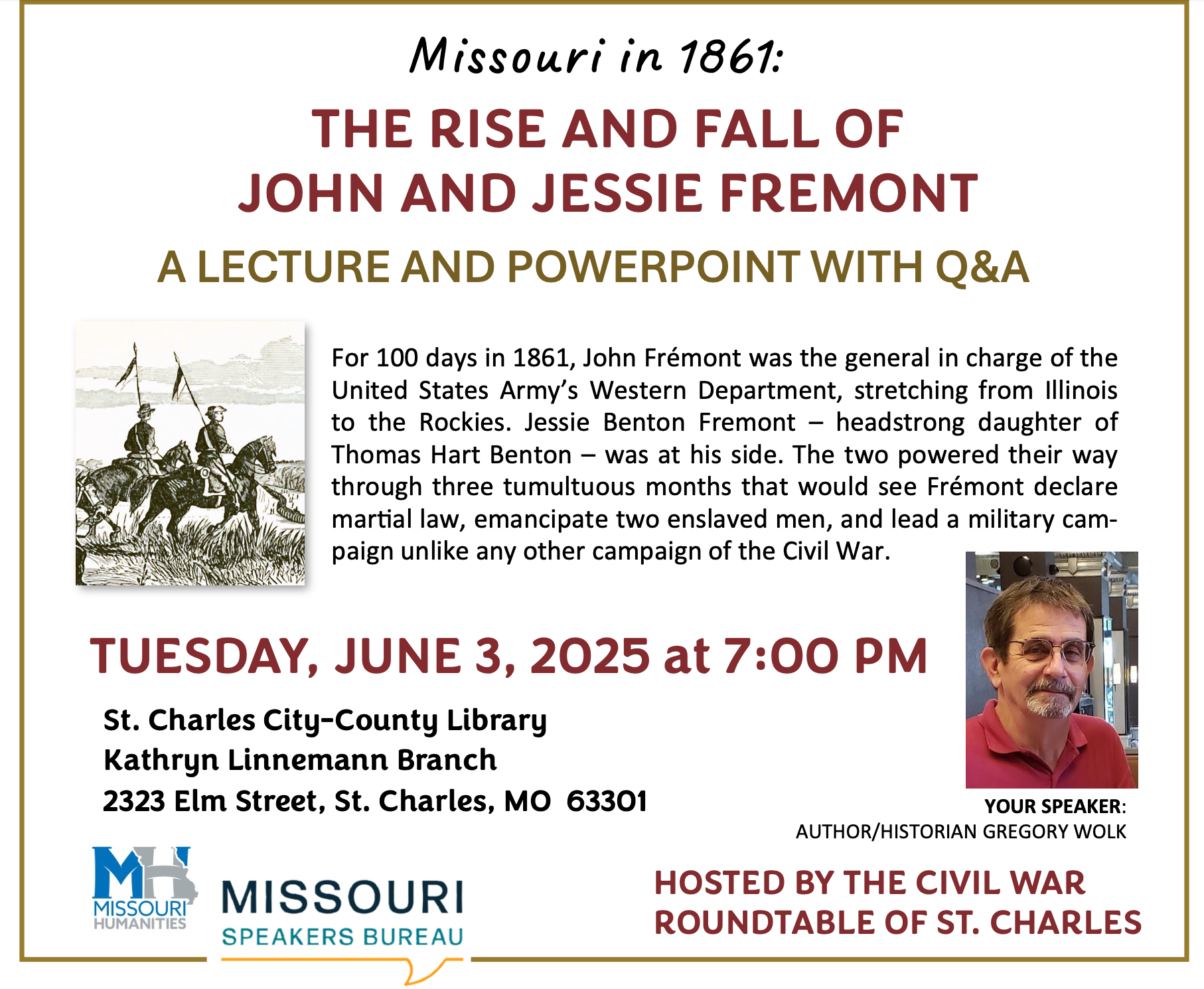 Meet the Civil War Roundtable of St. Charles Missouri. We invite you to join us in the Kathryn Linnemann Library, 2323 Elm Street in St. Charles, at 6 pm on the first Tuesday of each month. We have other interesting tours from time to time, have a monthly NEWSLETTERS, and a Facebook Page.