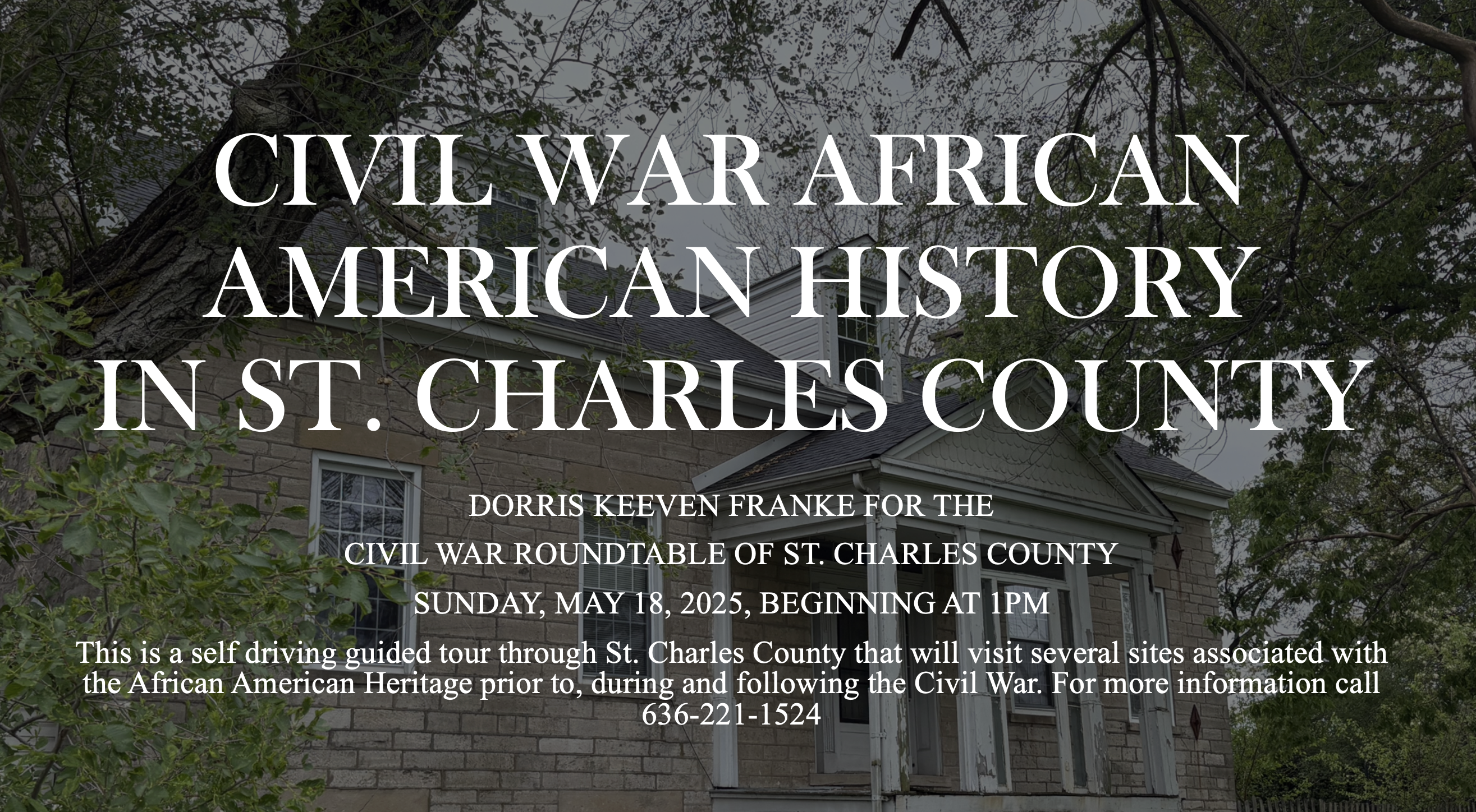 A free self-driving caravan tour on Sunday, May 18, 2025, will be led by author and historian Dorris Keeven-Franke. She will lead the participants through St. Charles County sharing seven important sites that reflect the enslaved experience prior to, during and following the Civil War. Learn about the life and death of Preacher Absolom White, a free black who lived in St. Charles and began the AME Churches. Visit Sage Chapel Cemetery listed on the National Register of Historic Places and one of the oldest black cemeteries in the county. Learn about Captain Campbell’s icehouse, where Archer Alexander learned Confederates were planning an attack on the local bridge and storing guns. Visit the Hopewell community where 43 men would join the Union’s U.S. Colored Troops. Then visit the site of the Peruque Creek Fort manned by the Missouri’s home Guards, where there was a Contraband camp nearby for the enslaved. Then visit the Smith Chapel Cemetery, listed on the National Underground Railroad Network to Freedom which is currently being restored by students from the St. Charles Community College. Finally end at St. Charles County Parks, also listed on the Network to Freedom, the site now of the Douglass Schoolhouse, reconstructed on the farm of freedom seeker Benjamin Oglesby. There the tour will end with an opportunity to discuss the afternoon’s events and ask questions. The tour is free and will begin at 1:00 pm at 550 Madison Street in St. Charles and will take approximately three hours and is being hosted by the Civil War Roundtable of St. Charles. The entire tour is via your personal cars and there is no entry to private homes. For more information or questions call 636-221-1524.